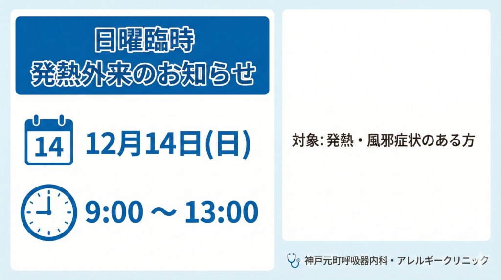 週末の発熱や風邪症状で不安な思いをされている方のために、本日は日曜日ですが特別にクリニックを開け、「発熱外来」を行います。