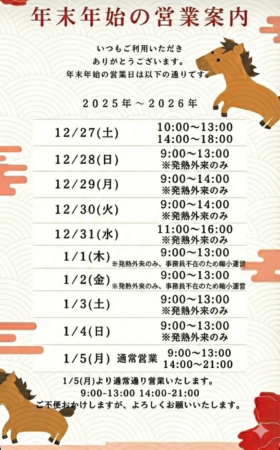 年末年始は発熱患者さんがたくさん来院され、スタッフの数が少ないため待ち時間等が長くなってしまう可能性があります。